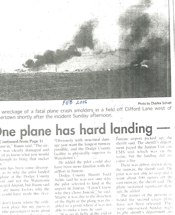 airplanes collided …. at 4:53 p.m. on Sunday, Feb. 5, 2006. Both aircraft were operated by Air Cargo Carriers Inc., based out of Milwaukee. One of the planes was destroyed during impact with the ground and subsequent ground fire. The second plane made an emergency landing at the Dodge County Airport in Juneau.