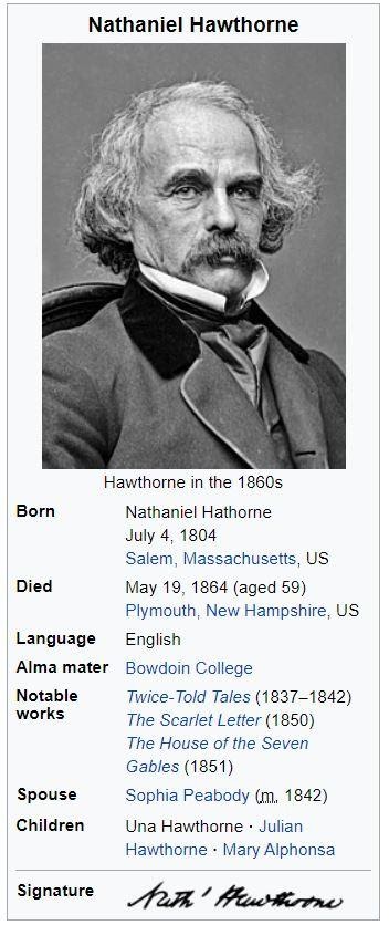 Nathaniel Hawthorne (/ˈhɔːθɔːrn/; né Hathorne; July 4, 1804 – May 19, 1864) was an American novelist, dark romantic, and short story writer.