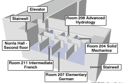 About two hours after the initial shootings, Cho entered Norris Hall, which housed the Engineering Science and Mechanics program among others, and chained the three main entrance doors shut. He placed a note on one of the chained doors, claiming that attempting to open the door would cause a bomb to explode.