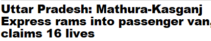 16 people were killed and three others seriously injured when the MathuraKasganj Express rammed into an overcrowded vehicle at an unmanned railway