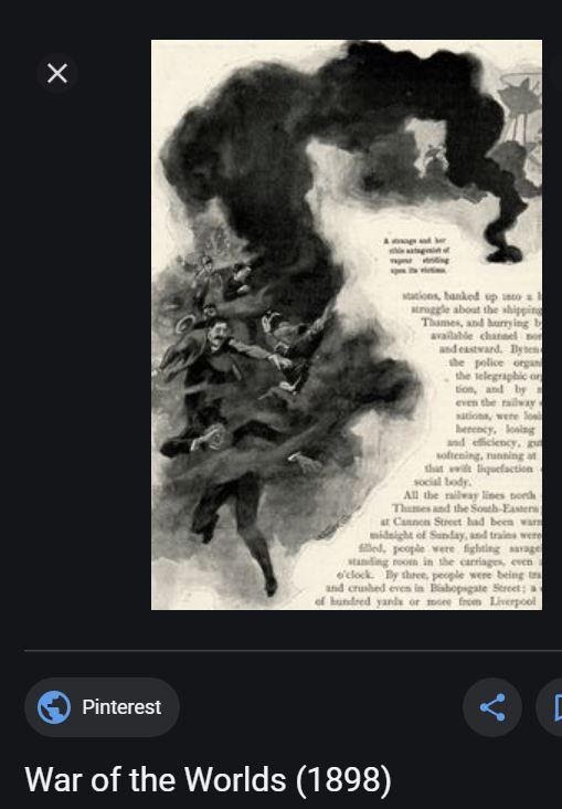 H. G. Wells‘ 1898 science fiction novel The War of the Worlds, used by the Martians to eliminate groups of humans, especially artillery crews, and conveyed by shells fired from a gun-like “black tube” carried by the Tripods’ whip-like tentacles.