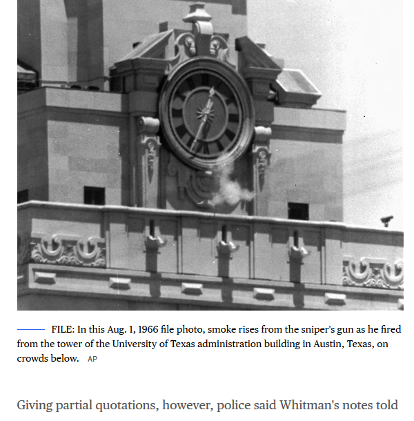 On August 1, 1966, after stabbing his mother and his wife to death the night before, Charles Whitman, a former Marine, took rifles and other weapons to the observation deck atop the Main Building tower at the University of Texas at Austin, then opened fire indiscriminately on people on the surrounding campus and …
