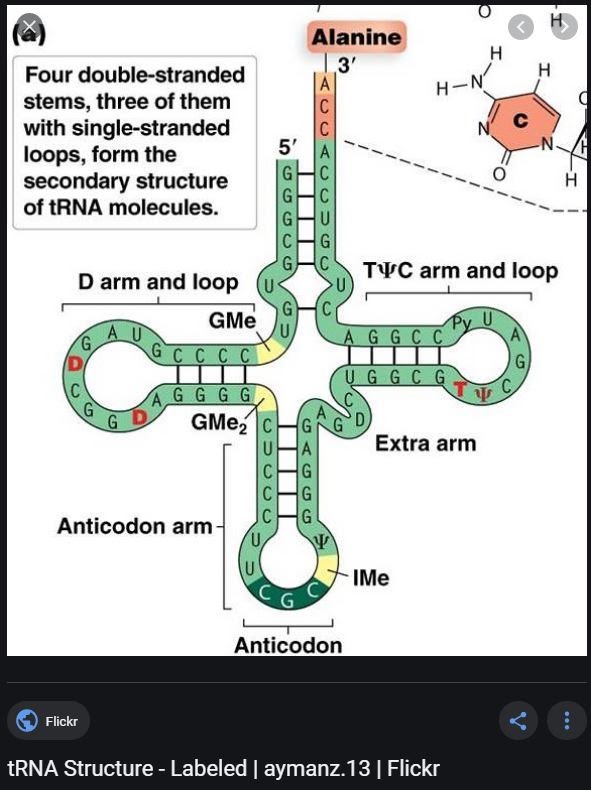 A transfer RNA molecule is used in translation and consists of a single RNA strand that is only about 80 nucleotides long, containing an anticodon on the other …
