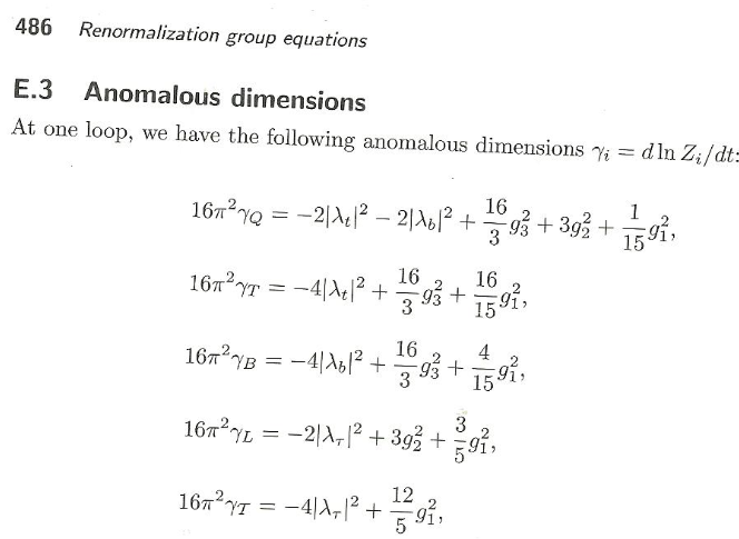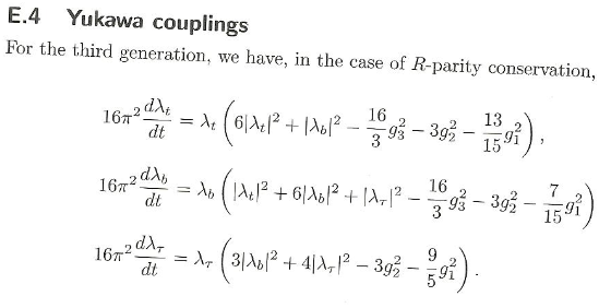 We see here a set of renormalization group equations which are scattered in the book. The notations….. In the case of Yukawa couplings, soft scalar masses, and A-terms, we give the third family couplings. To obtain the corresponding formulas for the other two families,one …