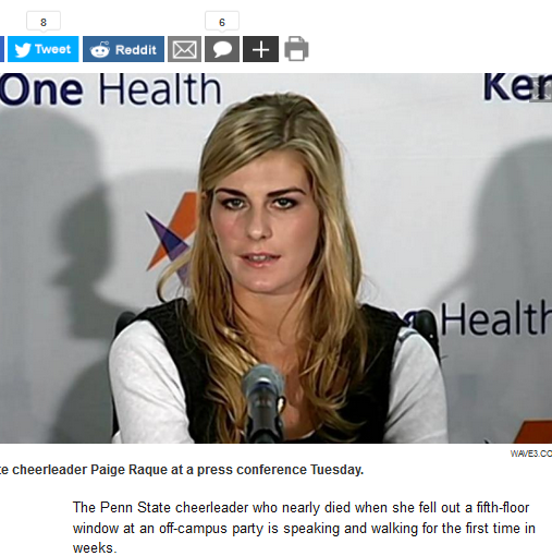 Oct 16, 2012 – … for Paige Raque, a 19-year-old cheerleader who fell 39 feet to the pavement from an off-campus apartment complex’s fifth floor on Saturday, …