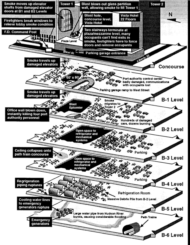 The 1993 World Trade Center bombing was a terrorist attack on the World Trade Center, carried out on February 26, 1993, when a truck bomb detonated below the North Tower of the World Trade Center in New York City. The 1,336 lb (606 kg) urea nitrate–hydrogen gas enhanced device[1] was intended to send the North Tower (Tower 1) crashing into the South Tower (Tower 2), bringing both towers down and killing thousands of people.[2][3] It failed to do so but killed six people and injured over one thousand.[4]