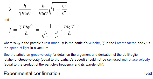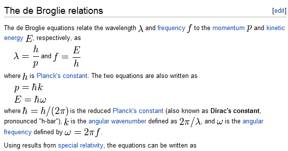 In quantum mechanics, a matter wave or de Broglie wave ( /dəˈbrɔɪ/) is the wave (wave–particle duality) of matter. The de Broglie relations show that the wavelength is inversely proportional to the momentum of a particle and that the frequency is directly proportional to the particle’s kinetic energy. The wavelength of matter is also called de Broglie wavelength.