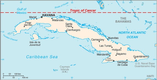 - Cuba www.voz.utwente.nl/~voz/index.php/en/latin-america/cuba Due to its geographic location Cuba was called Key to the New World and Wall … The Cuban archipelago is close to theTropic of Cancer marking the northern … Cuba Geography Guide www.kwintessential.co.uk/articles/cuba/Cuba–Geography-Guide/252 Cuba is situated just south of the tropic of Cancer. Physical geography of Cuba. Cuba is the largest Island in the West Indies. The total surface area of Cuba is … >