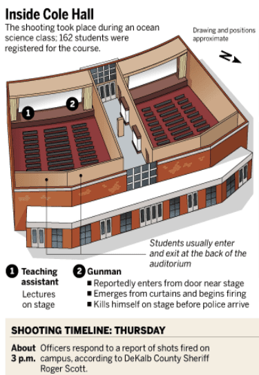 At approximately 3:05 p.m. CST, Steven Kazmierczak entered a large auditorium-style lecture hall inCole Hall (Auditorium 101) with approximately 120 students …