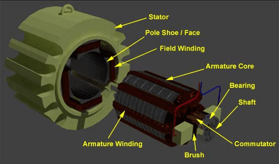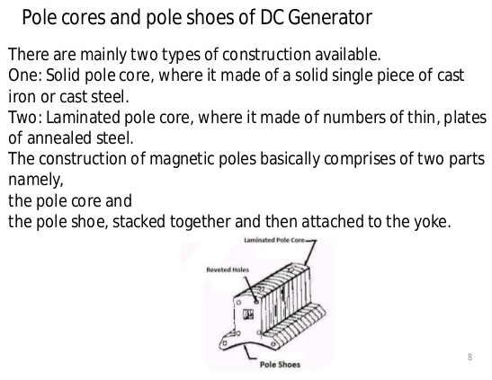 • A dc generator is an electrical machine which converts mechanical energy into direct current electricity. … Yoke: The outer frame of a generator or motor is called as yoke. … Pole shoePole shoe is an extended part of the pole which serves two …