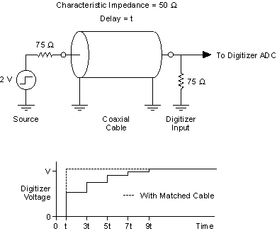 Selectable termination impedances are provided at the digitizer inputs to accommodate the most popular coaxial cable characteristic impedances: 50 Ω and 75 Ω. The diagram below illustrates what happens when a coaxial cable of the wrong characteristic impedance (50 Ω) is used with 75 Ω source and load impedances.