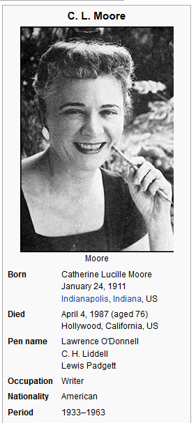 Catherine Lucille Moore (January 24, 1911 – April 4, 1987) was an American science fiction and fantasy writer, most often as C. L. Moore. She was amongst the …Biography – Selected works – See also – Notes