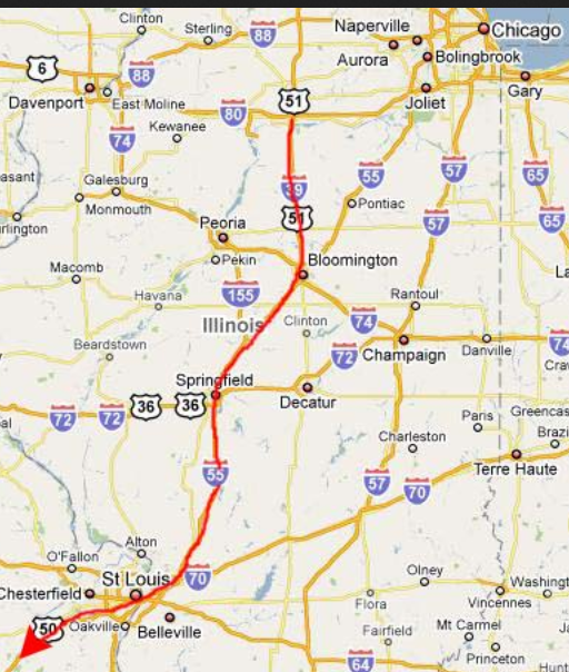 Let’s look at other  LIVER communications links using atomic number of IRON 55.85….  ..such as Interstate Highway 55  from Chicao to St.Louis. .