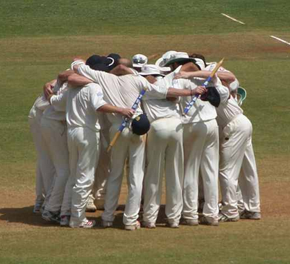 England huddle to celebrate victory over India in Mumbai, March 2006
