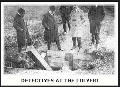 Leopold and Loeb posed with Crowe and his staff after their confession. … The culvert near Wolf Lake in which the body was found was near railroad tracks.