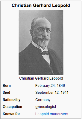 Leopold is remembered for the eponymous “Leopold maneuvers” (Leopold-Handgriffe), which are four classic maneuvers used to determine the position of the fetus within the uterus. Beginning in 1894 he was co-editor of the Archiv für Gynäkologie with Adolf Gusserow (1836-1906). Also, with Dr. Credé and Paul Zweifel (1848-1927), he published textbooks on midwifery