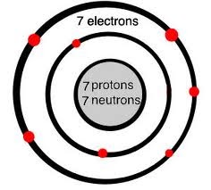 Below, nitrogen atom with nucleus = 7 + 7 = 14