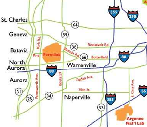 FermiLAB near DuPage County (Chicago region) provides the bi-directional geography ROAD MAP  for  53 and 35 (355).